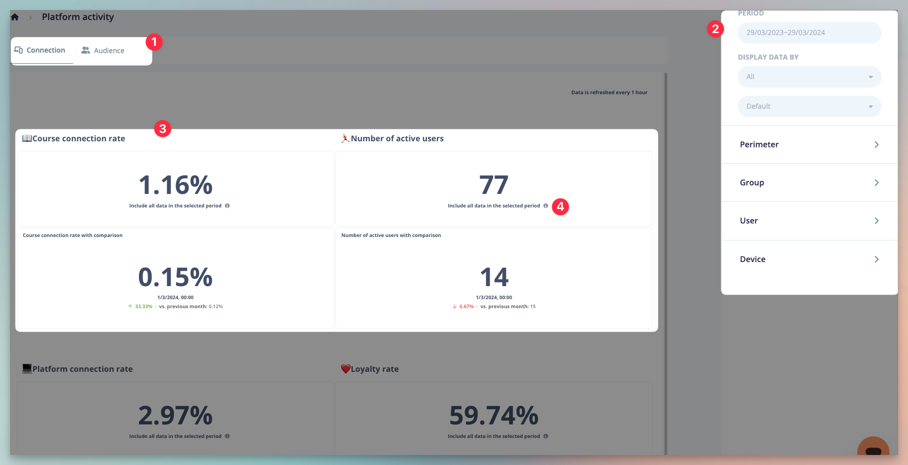- Offering a larger range of metrics such as loyalty rate, connection rate, active users, evaluation response rate, attendance rate, quiz success rate, comparison between average real learning time vs educational duration. Archived data is now also available!